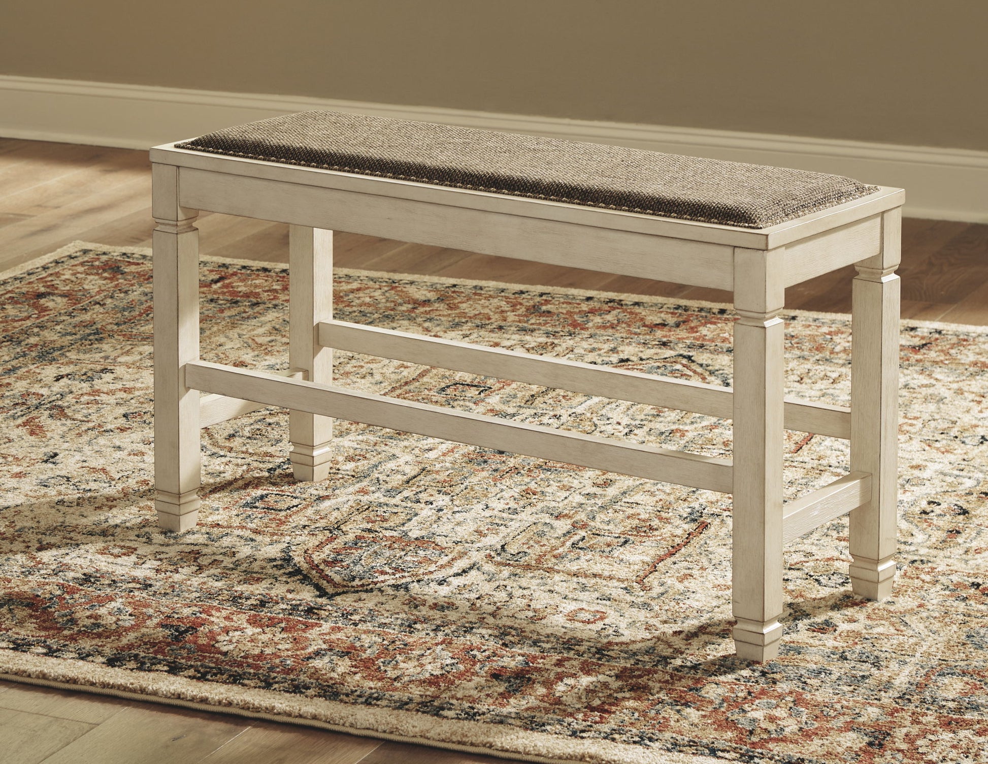 The beauty of this upholstered dining bench is something to savor. Serving up comfort and flair, this generously scaled counter-height bench entices with a cushioned seat covered in a heavy woven fabric that complements the antiqued white finish.